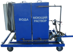 Мобильное устройство, производства ООО НПО «Экспериментальный завод», обеспечивает качественный нагрев и непрерывную подачу под нужным давлением специального моющего раствора объемом до 400 литров в коллекторы системы промывки ГТУ.