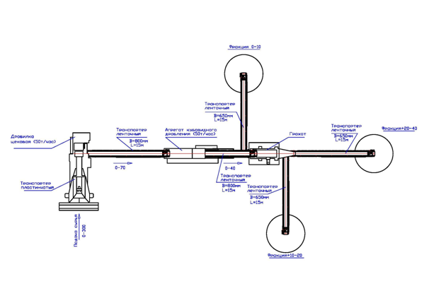 Переработка предполагает прохождение трёх стадий: предварительная (загрузка), промежуточная (дробление) и окончательная (грохочение). После прохождение всех этапов переработки на выходе получается готовый продукт заданной крупности.