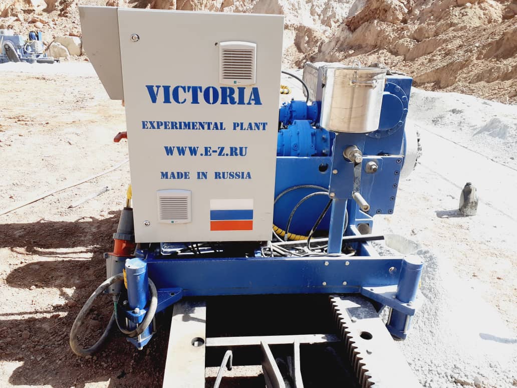 «Виктория» универсальна и производит все основные виды пропилов (горизонтальные подрезные, вертикальные продольные, поперечные), позволяющие осуществить отделение блока от карьерного массива. Наличие режима зарубки камнерезной пилы позволяет выпиливать блоки без предварительной проходки заходной и выходной траншей. Передвижение по рельсовому пути осуществляется гидравлическим двигателем.